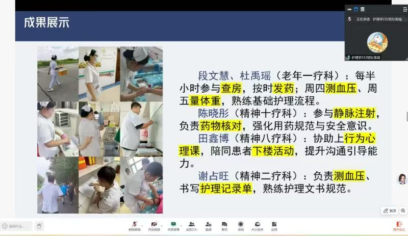 在汇报中,学生代表分享了实习期间的点滴经历。从最初对精神科护理工作的陌生与紧张,到逐渐熟练掌握各项操作技能,能够与患者进行有效的沟通交流,每一步成长都凝聚着他们的努力与汗水。一位学生回忆道:“有一次在护理一位情绪不稳定的患者时,我运用所学的沟通技巧,耐心倾听他的诉求,最终成功安抚了他的情绪。那一刻,我深刻体会到护理工作不仅仅是技术活,更是心与心的交流。”