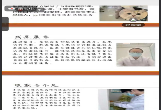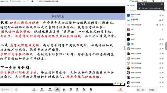 答辩环节,各小组有序汇报。同学们以PPT形式,清晰呈现实习全貌:从各个实习基地的环境、科室布局,到不同实习岗位的工作内容、各个组员的分工,最后到下一步学习计划,全方位展现实践轨迹。在成果展示中,学生们通过分享垃圾分类的掌握、专科护理操作精进、护患沟通能力提升等收获,也直面应急处理经验不足、护理计划个性化欠缺等问题,体现深刻反思。同学们思维敏捷,结合实践中的经验和所学理论知识,给出了令人满意的回答。尽管是线上交流,但思想的碰撞和知识的传递丝毫未减。