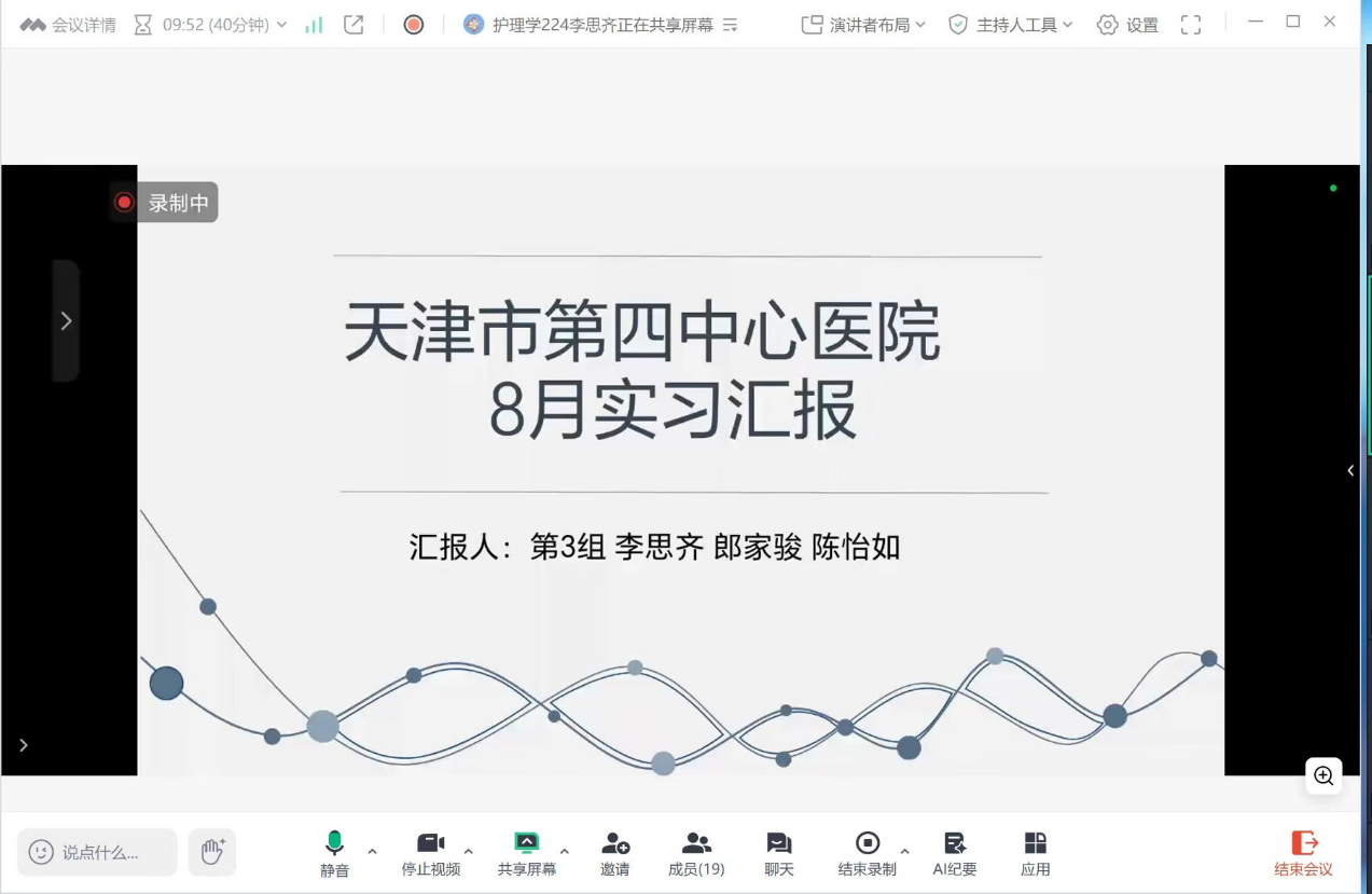 2025年8月31日晚,指导教师尹娜通过腾讯会议的方式召开天津市第四中心医院毕业实习8月份实习阶段总结会议,会议由李思齐同学主持,全体实习学生参加。