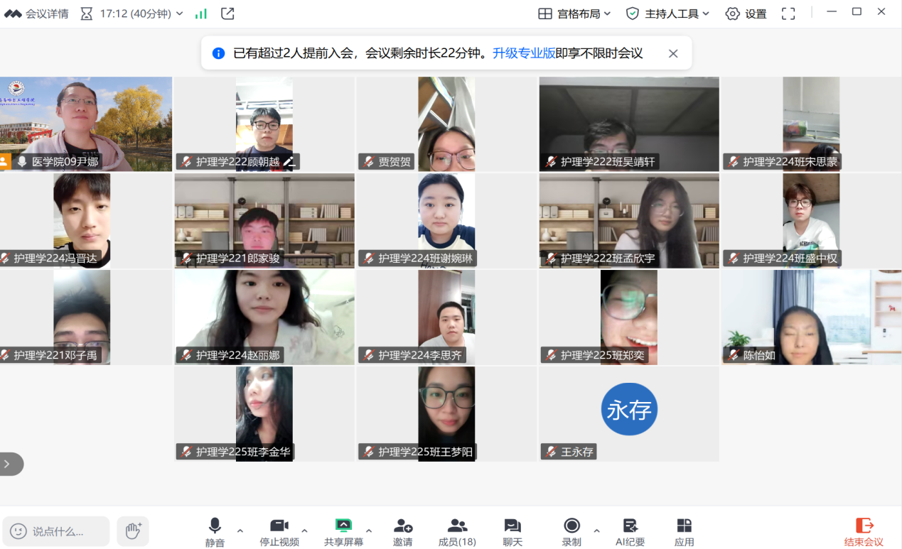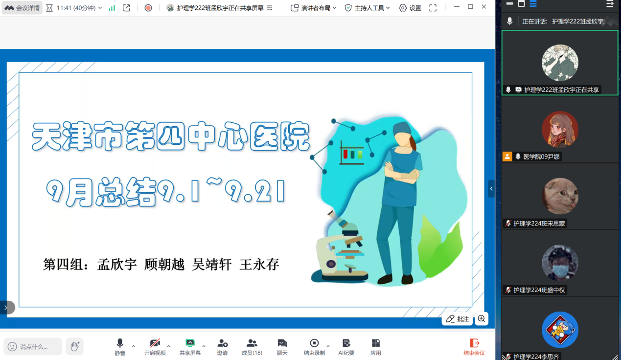 2025年9月25日晚,指导教师尹娜通过腾讯会议的方式召开天津市第四中心医院毕业实习9月份实习阶段总结会议,会议由孟欣宇同学主持,全体实习学生参加。