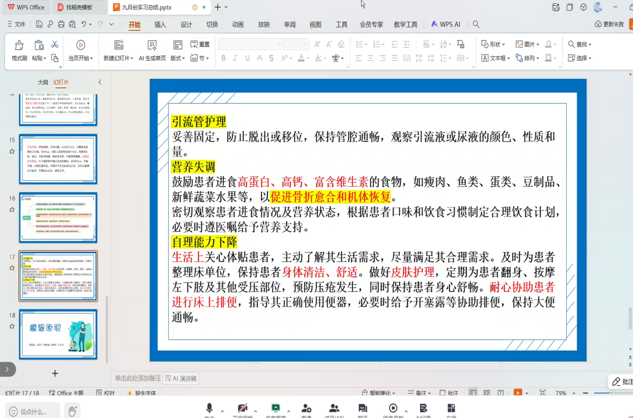 会议最后,指导教师尹娜对9月份全体学生的临床护理实习工作进行总结点评。老师充分肯定了同学们在实习中的积极表现与进步,同时指出了当前存在的问题,如部分操作熟练度不足、应急处理能力有待提升等,并针对性地提出了改进方向与学习建议。此外,尹娜老师特别强调,临床工作中需注重医患沟通技巧,避免与患者发生冲突,遇问题第一时间与带教老师沟通,防范不良事件发生。同时结合十一假期临近,提醒同学们做好假期安全防护,注意出行安全、用火用电安全,减少前往人员密集场所,确保假期安全无虞。关于下一阶段安排,尹娜老师明确,10月份起将启动个案报告撰写工作,要求同学们从现在着手收集临床案例,做好准备。