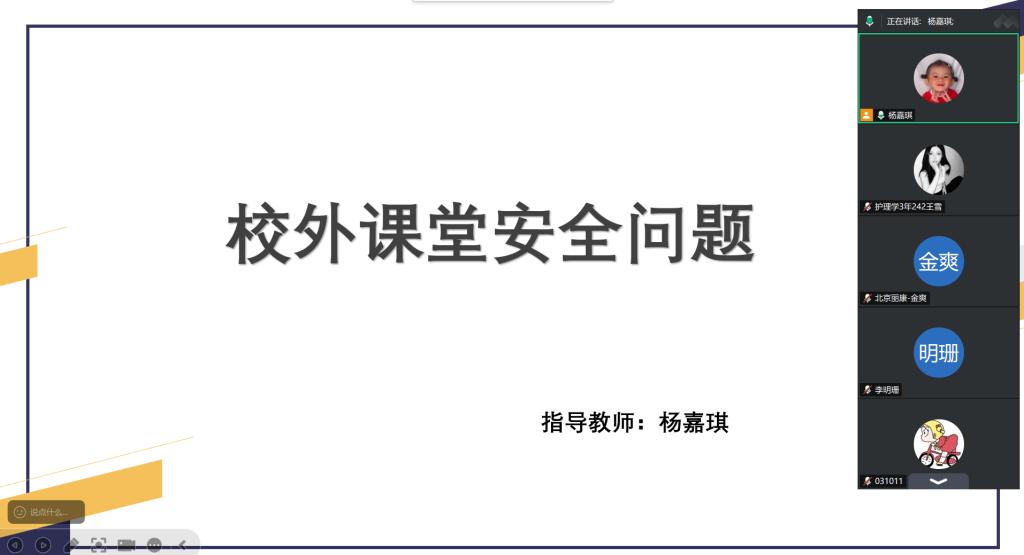 为保障校外课堂学生的人身安全与学习秩序,强化学生校外实践期间的安全防范意识和应急处置能力,11月3日晚上18:00,医学院教师杨嘉琪组织昆山国宾体检中心和桐鑫口腔门诊校外课堂的全体学生,以线上的形式召开学生安全专题教育会议,重点围绕校外学习期间的各类安全问题展开。