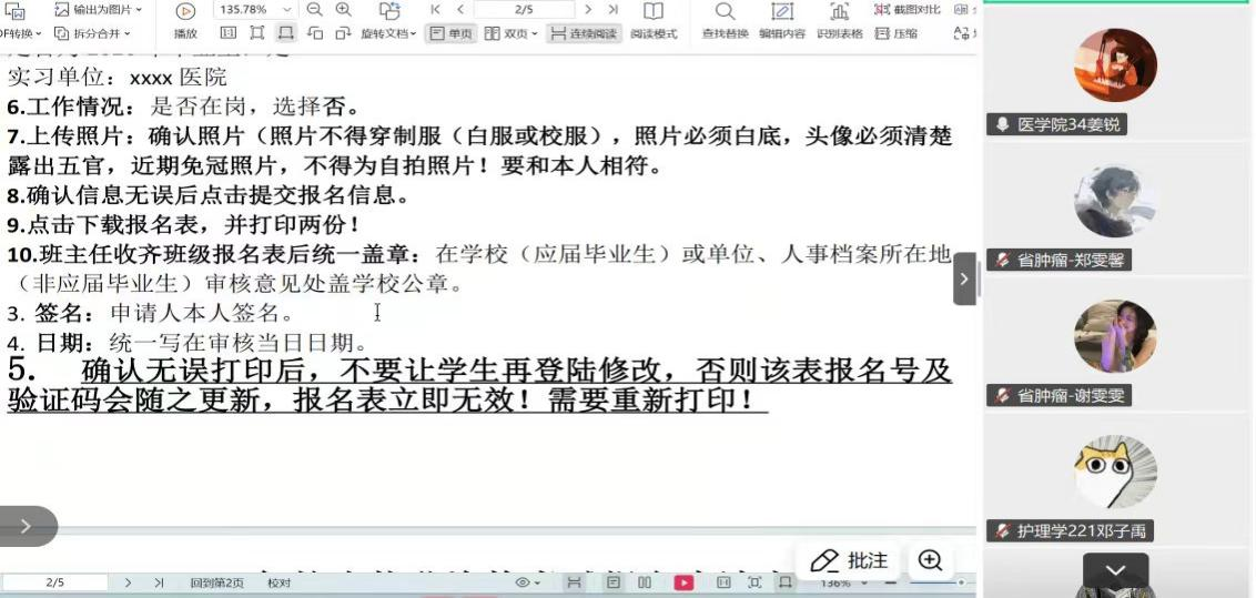 姜锐老师在会议中讲解护资报考环节,会议明确了全流程规范与材料细则:12月9日前需在指定官网完成电脑端注册,个人关键信息及报名表提交后不可修改,报名表需打印2份并亲笔签名;材料需准备白底标准证件照、匹配学历的学籍档案,实习经历要满足医院资质、科室名称与手册一致且时长满8个月的要求;资格审核需提供有效期至2026年3月后的身份证(原件需邮寄回校),自主实习还需额外提交双章接收函、机构执业许可证及护理部负责人座机号。
