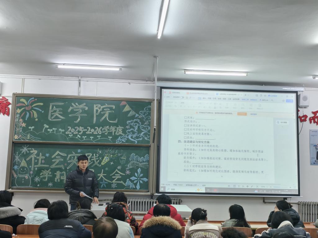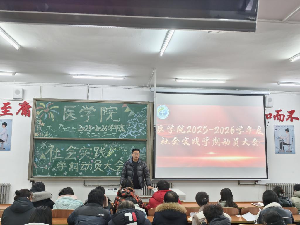2025年12月19日,医学院2025—2026学年度社会实践学期动员大会成功召开。会议伊始,首先由医学院党委副书记姜宏伟老师宣读《2025-2026学年度社会实践学期实施方案》,方案明确以“六大必修项目”为核心,全面融入德育、智育、体育、美育、劳动教育五大维度。随后,姜老师以专业之能、严谨之态对实践手册进行详细解读,重点强调了五育的重要意义:德育是铸魂之本,关乎学生理想信念与品德修养的培育;智育是增智之基,助力学生将专业知识转化为实践能力;体育是强体之要,为学生身心健康与长远发展筑牢根基;美育是润心之径,滋养学生审美情怀;劳动教育是砺行之策,锤炼学生劳动本领、培育节约美德与责任担当,为后续实践活动的规范有序开展筑牢了坚实根基。