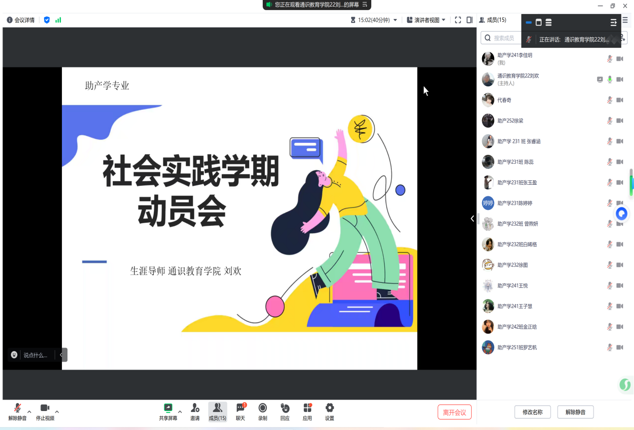 首先,刘欢老师着重强调了社会实践学期期间的核心要求,明确指出需按时提交过程性材料、全员参与线上会议等,避免因材料审核不合格或任务遗漏,导致出现重修或成绩记零的情况。其次,刘欢老师对重点任务与注意事项做出说明,强调面向高三学生开展母校宣传时,应优先推荐分数匹配且有学医意向的学子。最后,刘欢老师解答了学生们对社会实践学期的疑问。