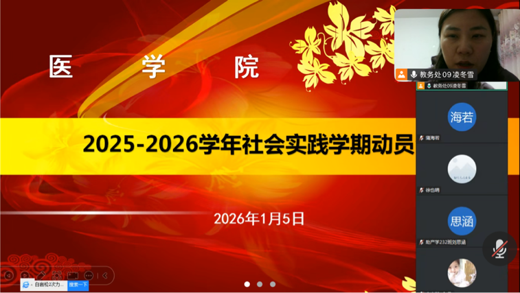 2026年1月5日晚7点30分,指导教师凌冬雪老师在腾讯会议开展了2025-2026学年度社会实践学期动员会,四组同学参加了此次会议,会议正式开始前凌冬雪老师统计了学生们的归家情况并强调本次社会实践学期的重要性。社会实践学期主要是通过丰富多彩的实践活动,提升同学们的德智体美劳以及社会责任感,同学们要秉持“我们面前无困难,困难面前有我们”的亮剑精神来迎接此次社会实践学期。