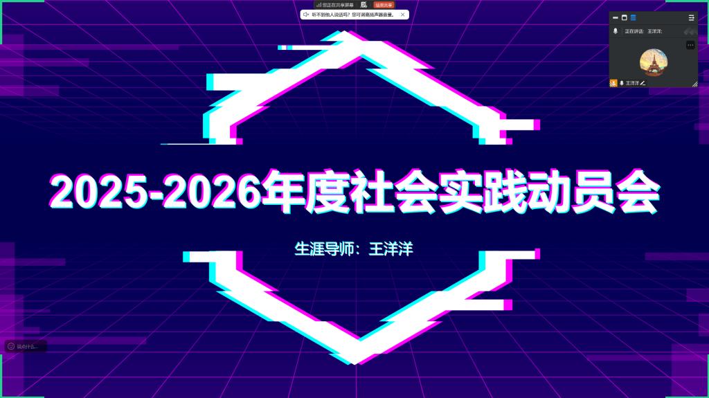 为扎实推进“三全育人”综合改革,落实学校实践育人理念,帮助学生明确2025-2026学年社会实践学期的目标任务与实践要求,近日,生涯导师王洋洋召开社会实践学期动员会。23-25级全体生涯学生参会,共同拉开王洋洋老师组本学年社会实践学习的序幕。围绕“提升学生核心素养,强化‘三五能力’”的核心目标,王洋洋老师详细阐述了实践学期的指导思想、时间安排及相关要求。明确实践学期将以“必修+选修”相结合的模式开展,覆盖6周实践周期(2026年1月5日—2月27日),讲解必修与选修两大板块的具体要求。必修内容涵盖调查报告、给未来的信、我的符号我做主、青春FUN肆拍、志愿服务、寻新“荐”面礼六大项目,总分50分。其中,调查报告需结合专业与职业规划,深入家乡企事业单位调研人才需求,完成不少于3000字的原创报告;志愿服务要求以专业技能为依托,参与“返家乡”公益服务不少于4小时;寻新“荐”面礼作为关键任务,要求学生返回高中母校或面向目标群体宣传学校优势,未完成则实践成绩不合格。选修内容则聚焦专业实践与“五育并举”通识课程,学生需在德育、智育、体育、美育、劳动教育中各选至少一门课程学习,通过技能实践、课程研修等形式提升综合素养。