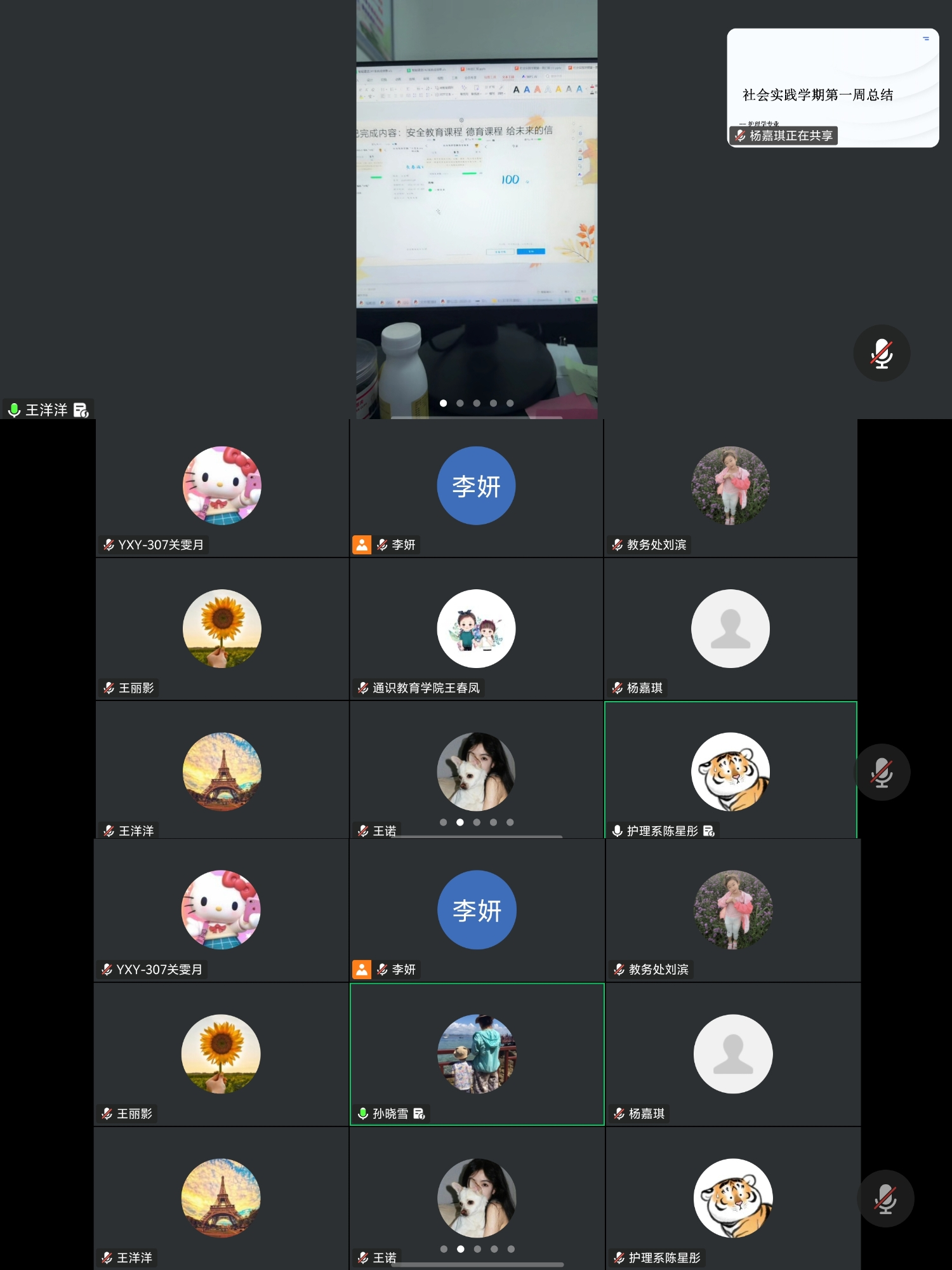 随后,王洋洋、陈星彤、孙晓雪三位教师代表依次汇报所负责小组的第一周实践情况。王洋洋老师表示,学生已基本完成“给未来的自己一封信”、德育教育、安全教育及调查问卷撰写等必修内容,部分学生已进入问卷发放阶段,整体进展顺利。陈星彤老师介绍,学生完成情况良好,调研报告框架已初步构建,学生对AI辅助学习内容反馈积极,相关材料正在有序整理中。孙晓雪老师汇报,所在小组26名学生中,14人完成学校吉祥物设计,13人完成专业吉祥物设计,2人已完成社会实践视频拍摄,德育学习覆盖全体学生,其余任务正按计划推进。