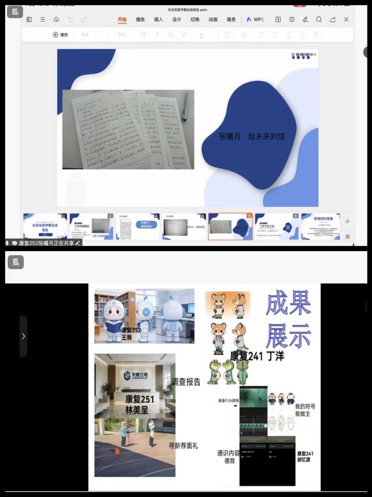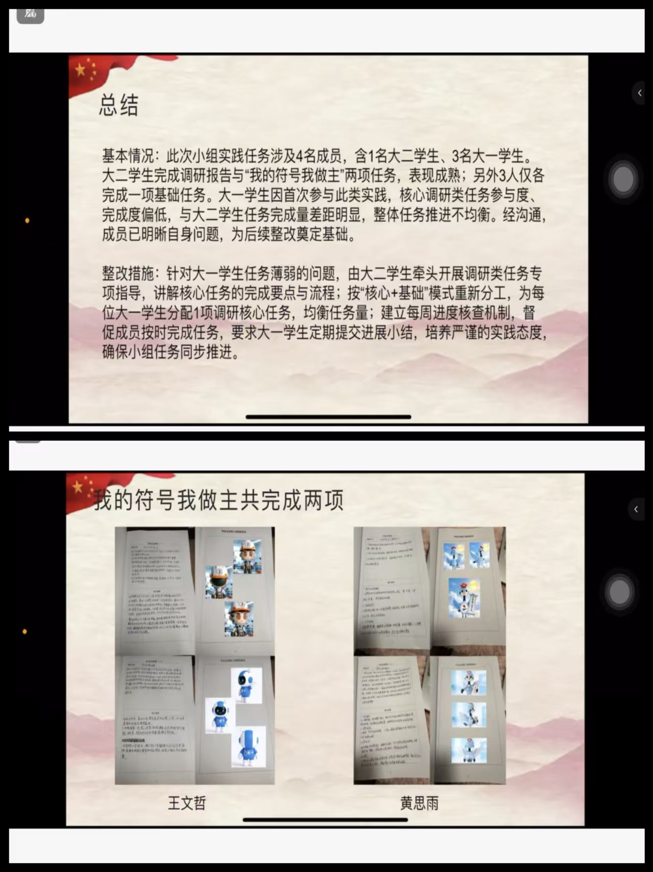 汇报中,各小组成果各有特色:第一组聚焦康复治疗人才需求调研,完成调查问卷的设计、发放与调研报告撰写,同时同步完成学习通德育、安全教育课程的学习,将专业调研与理论学习深度结合;第二组围绕“给未来的信”等特色任务创作,通过手写、创意设计等形式,展现了康复专业学生的人文素养与创新思维;第三组完成“我的符号我做主”创意任务与康复治疗人才需求调查问卷设计,在创意实践和专业调研领域均有成果;第四组完成卡通及动漫形象设计、企业调研报告撰写、视频制作与通识德育内容整理等工作,在核心调研与创意实践上均实现突破。