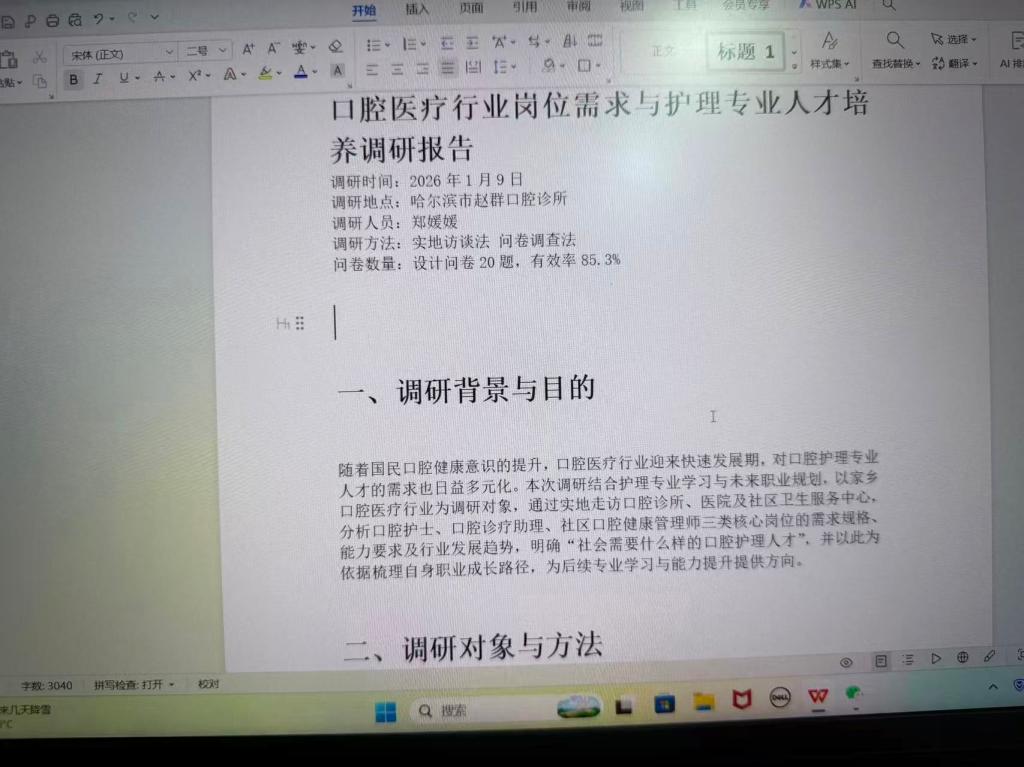 团队成员郑媛媛 聚焦口腔健康领域开展专项调查。为确保调研数据的真实性与全面性,该成员提前查阅大量口腔健康相关文献,设计科学合理的调查问卷,涵盖不同年龄层人群的口腔护理习惯、常见口腔疾病及就医意愿等内容。通过对回收的有效问卷进行整理与初步分析,成员不仅梳理出大众口腔健康认知的盲区,也为后续形成完整的调研报告奠定了坚实基础。
