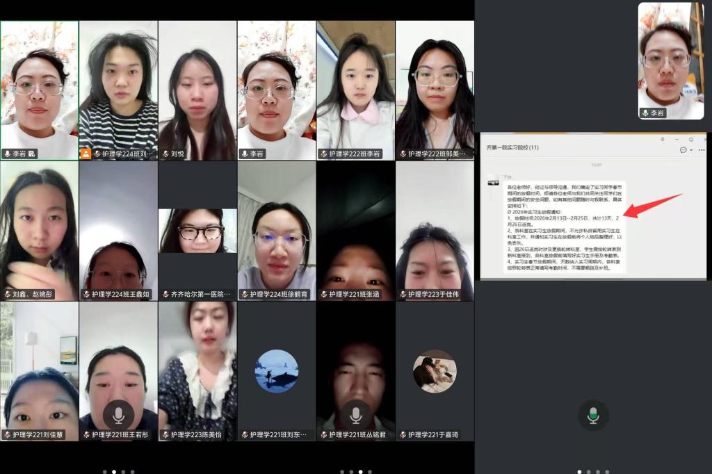 1月14日晚20:30,齐齐哈尔市第一医院实习生安全会议在线上如期举行,指导毕业实习的李岩老师主持会议,21名实习学生悉数参加。本次会议围绕春节放假安排与假期安全两大核心内容展开,为同学们度过一个平安、有序的假期筑牢坚实保障。