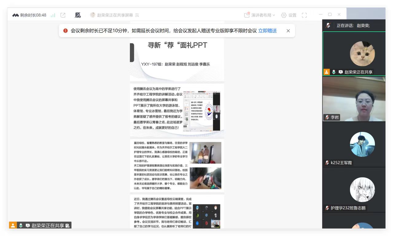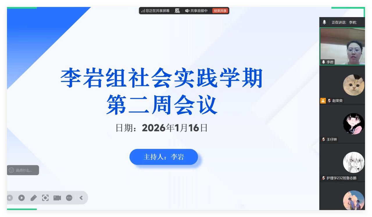 1月16日晚20:30,李岩老师通过腾讯会议主持召开社会实践学期第二周会议,全体参与实践的同学线上参会。本次会议重点围绕同学们完成的“寻”新“荐面礼”实践活动展开总结,并布置下一阶段实践任务。