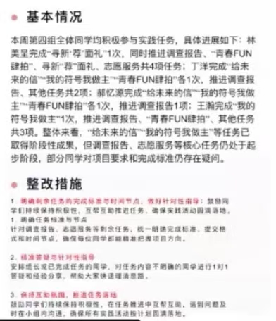 汇报中,各小组成果各有特色:第一组聚焦吉祥物创作以及调查问卷的发放;第二组围绕“我的美食日记”特色任务创作,以及母校回访宣传展开;第三组完成“我的符号我做主”创意任务与吉祥物设计,在创意实践区域有落地成果;第四组全组完成“青春FUN拍”任务,并在“给未来的一封信”任务上取得阶段性成果。