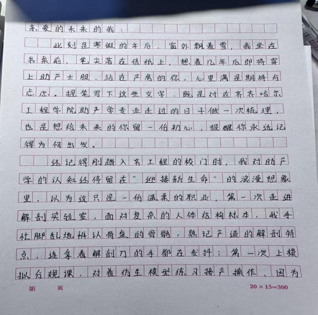 鄂巧馨、宋怡、于韵涵同学还写下致未来自己的一封信,梳理专业学习与实践感悟,她们展望职业发展方向。在撰写过程中,每一位同学都厘清了自身的职业定位与成长目标,更坚定了投身助产事业的初心。反思过往学习,意识到自身在应急处置能力与前沿助产技术储备上仍有不足,未来将加强临床见习与专业文献研读,补齐能力短板。