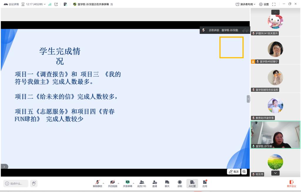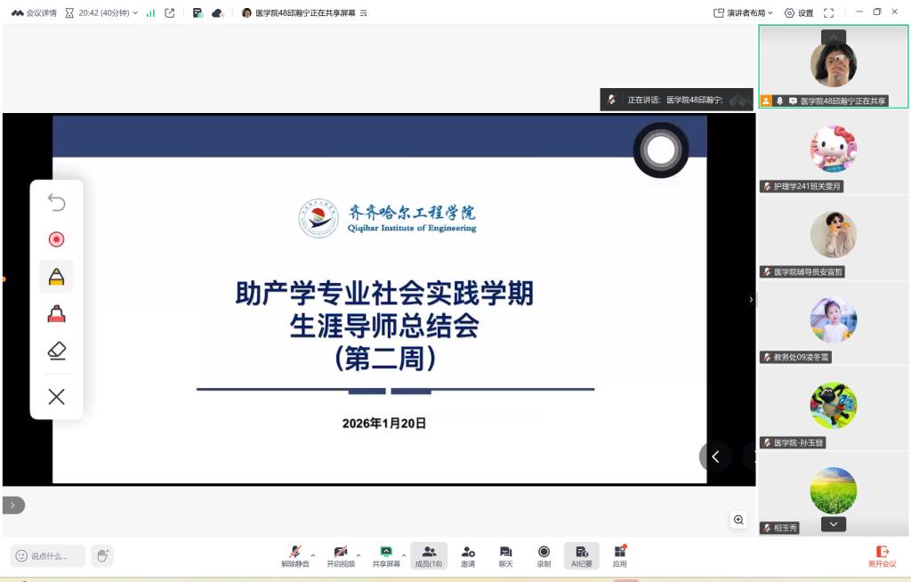 为及时掌握学生实践动态、统一任务标准并集中回应第二周出现的共性问题,助产学专业于1月20日组织开展社会实践学期助产学专业生涯导师第二周线上总结会。会议由辅导员邱瀚宁老师组织开展,助产学专业辅导员江丽娜、安宣哲及全体生涯导师参会。