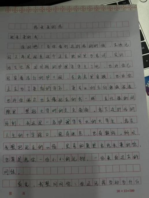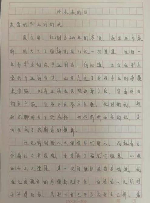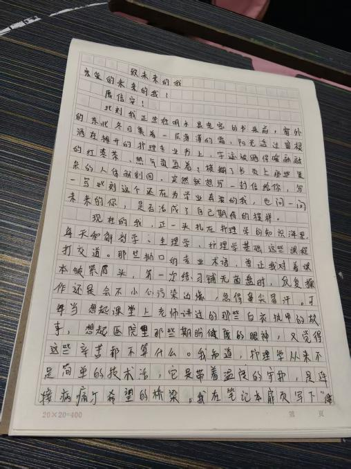 王洋洋在信中重温初入校园时立于南丁格尔像前的那份敬畏,她叮嘱未来的自己务必练好静脉穿刺、无菌操作等基本功,在临床一线成为患者踏实可靠的生命哨兵。她将对护理事业的初心,转化为对技能与责任的具体期待。