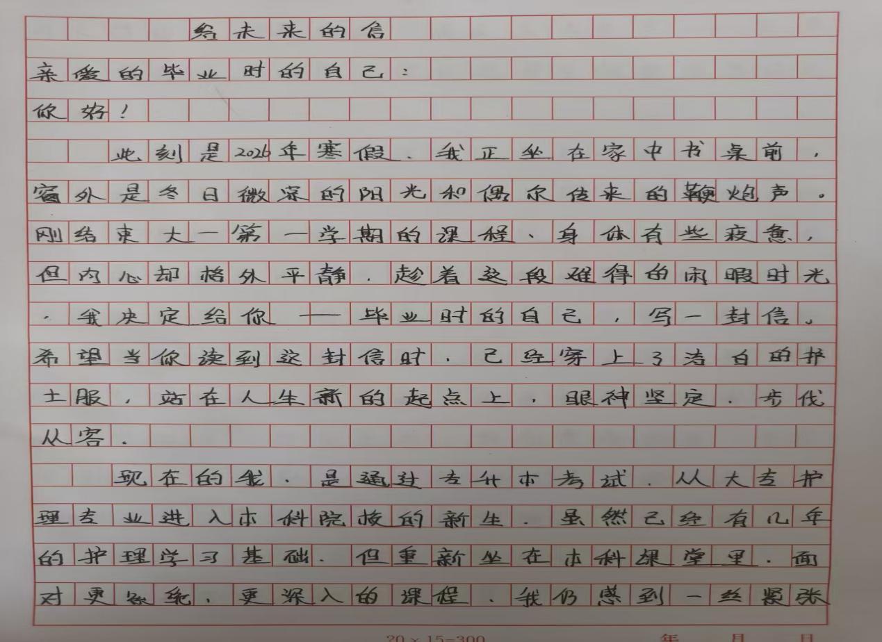 大一学生马立哲在寒假提笔写下致毕业时自己的信时,正值期末考试后的疲惫期。“面对繁重的课业和对未来的迷茫,我选择用书信与未来的自己对话。”他在信中坦言初入护理专业的懵懂,却也满怀期许:“愿三年后的我,不负初心,成为一名有爱心、有责任的护理工作者。”稚嫩的字迹中,透露出他对职业的向往与自我鞭策。