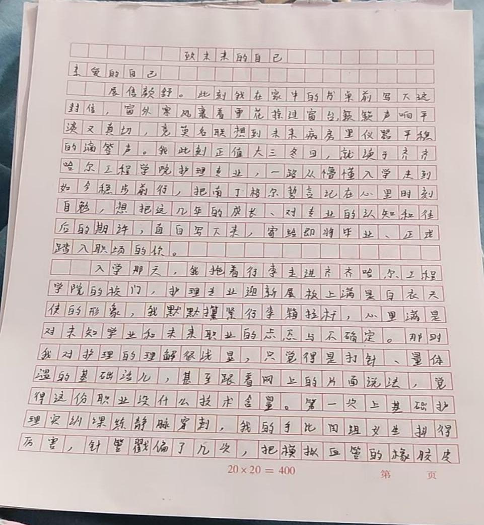 范广鑫同样在信中梳理了实训课的手忙脚乱、海伦市社区志愿服务的触动,以及案例分析中的合作成长。他查阅行业趋势后,坚定了重症专科方向,并在信末特别写下对平衡工作与生活的期许:“用最朴实的文字,把当下的所思与未来的叮嘱都融进这封信里。”