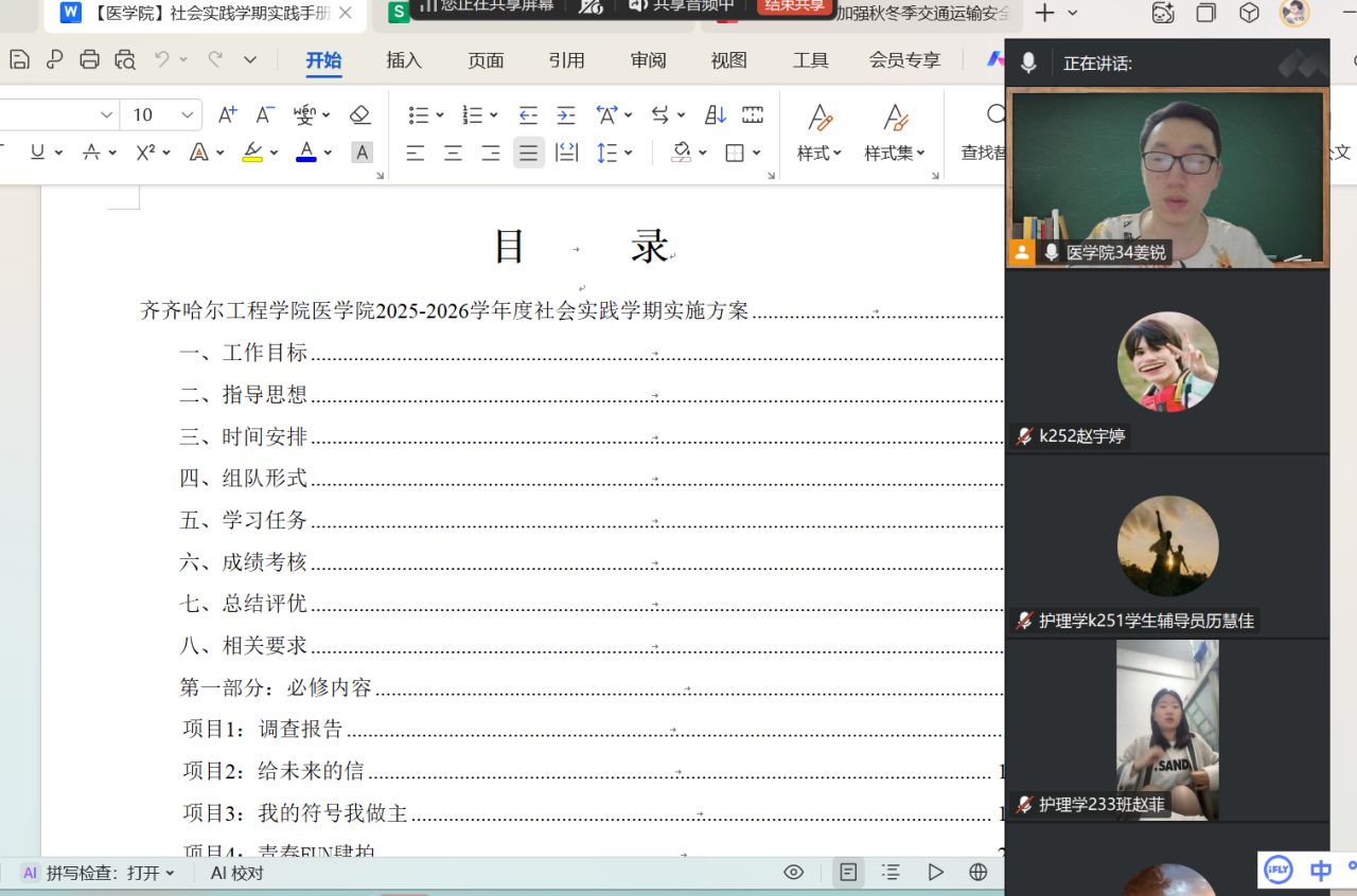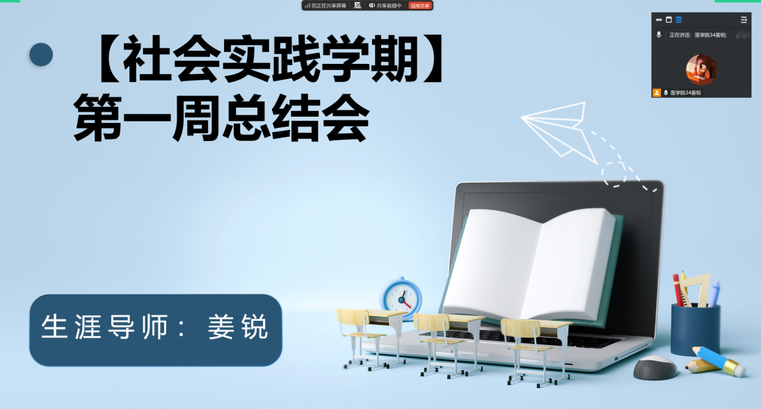 2026年1月11日,为了更好地进行社会实践学期,了解同学们的学习进度并督促同学们,医学院生涯导师姜锐在腾讯会议召开社会实践学期第一周总结会,会议由姜锐老师主持,全体同学共同参加。