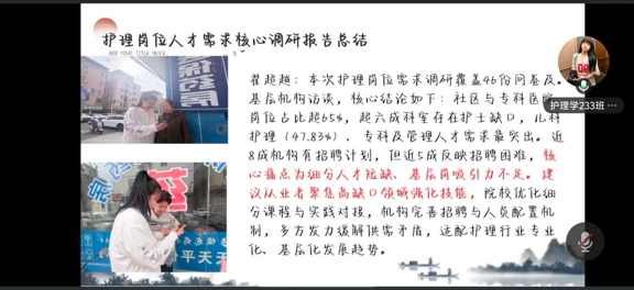 会议伊始,李岩老师对同学们上周开展的社会调研工作进行全面总结,详细询问了各小组调研进展与实际情况。本次共有30名同学参与实地调研,分别前往药店、医院、社区卫生服务中心、医院电梯维修部门等不同场所,深入了解各岗位的具体工作内容、岗位需求,以及胜任该岗位所需的专业技能与职业素养,为后续实践报告撰写积累了丰富素材。
