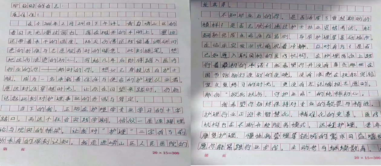 李美静同学写致未来的自己:愿你始终怀揣护理人的温柔与坚定,专业上精益求精,练就过硬本领;生活里心怀暖阳,不惧前路风雨。保持对生命的敬畏,对职业的热爱,以微光之力护佑安康,在平凡的岗位上,活成自己想要的模样。