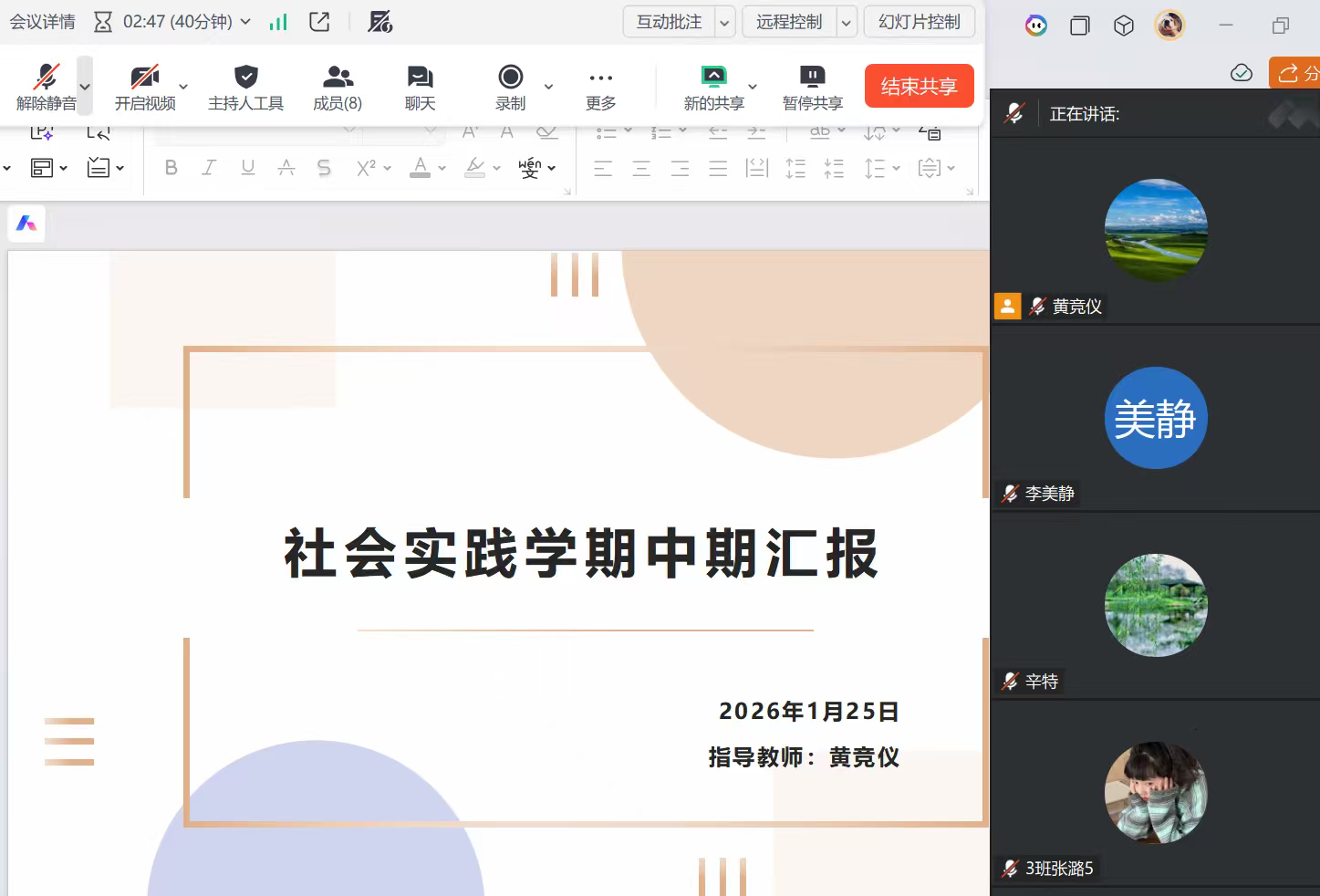 为及时跟进社会实践进度,保障实践质量,2026年1月25日晚上,社会实践中期汇报线上会议如期举行,本次会议由指导教师黄竞仪主持,全体参与社会实践的同学参会。