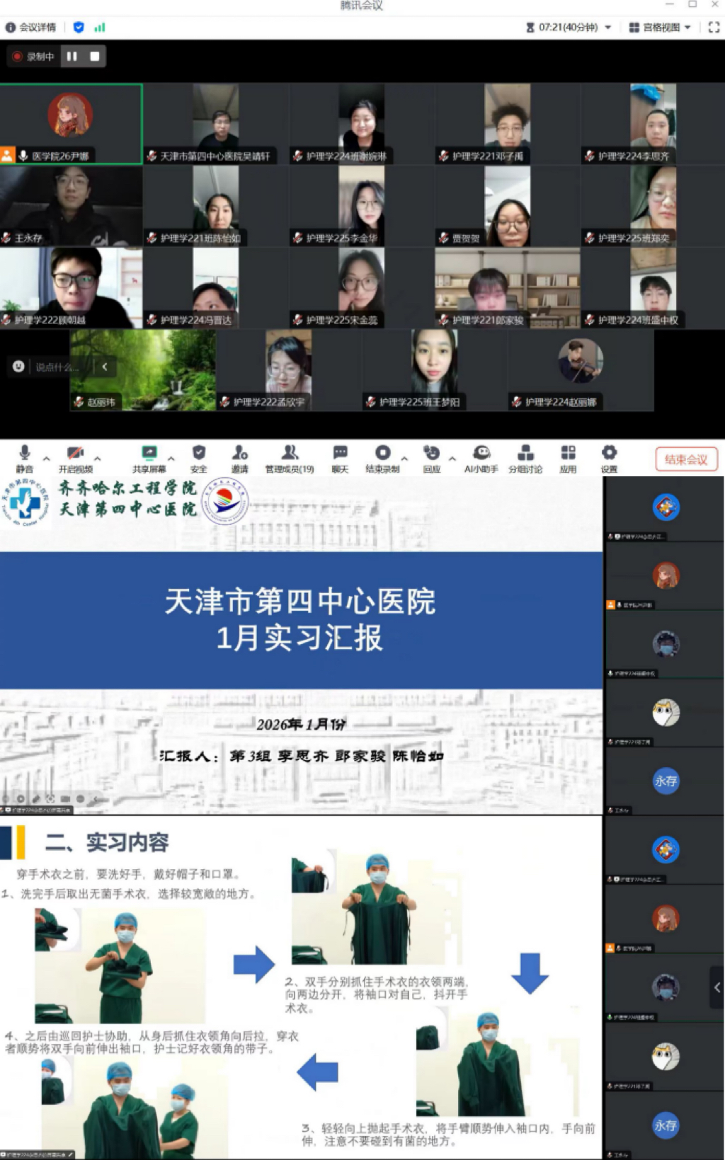 2026年1月28日晚,指导教师尹娜通过腾讯会议的方式召开天津市第四中心医院毕业实习1月份实习阶段总结会议,会议由李思齐同学主持,全体实习学生参加。