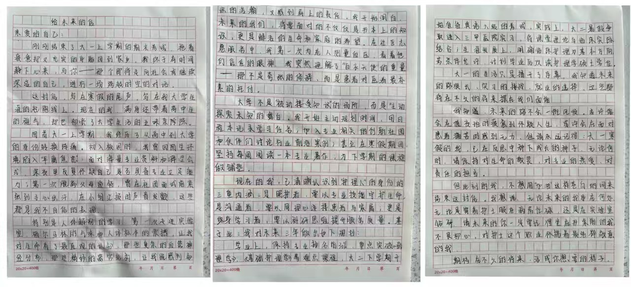 第一位成员石湘涵以“自我成长与理想表达”为主题,完成了“给未来的信”的撰写与封装。石湘涵同学静下心来梳理过往成长经历、当下学习状态与未来职业规划:回顾进入大学后的蜕变与收获,剖析自身优势与不足,明确未来1—5年的发展目标。此次“给未来的信”活动,不仅是一次自我反思与沉淀,更让青春理想有了具象的寄托,为未来的成长之路注入了温暖而坚定的力量。