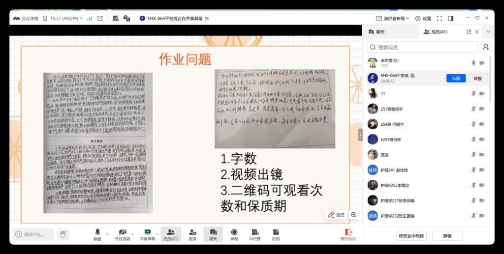 会议首先围绕近期作业完成情况展开反馈与提醒。平贺成同学代表发言,指出目前作业中存在三类共性问题:一是部分作业字数不足,需进一步补充完善;二是视频材料中出镜不规范,存在仅使用图片、未露正面等情况,要求后续视频中必须包含个人或家长正面出镜;三是部分二维码有效期短、可扫描次数有限,建议通过合理方式延长至永久有效,以符合后续专业视频提交要求。米冬雪老师补充强调,所有同学务必进入指定学习平台并完成视频观看与答题,确保学习环节不留遗漏。