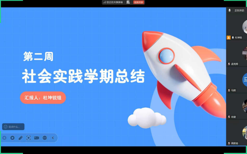 2026年1月18日,2025-2026学年社会实践学期第二周圆满结束。杜坤锐组围绕开展本周工作存在问题等召开小组总结会议。重点完成了本周社会实践学期内容汇报,同学们始终保持积极及时的参会节奏,顺利完成本周总结。