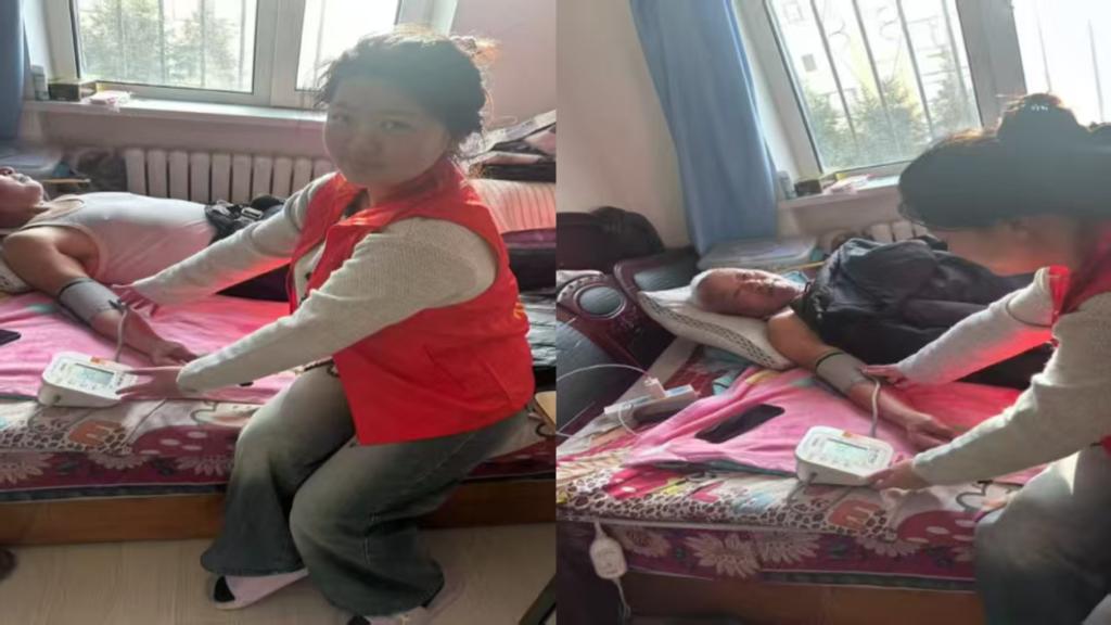 我们几名志愿者带着血压计,上门为行动不便的独居张大爷测血压。进屋时大爷正躺在花床单的床上,我坐在床上身轻柔地为他缠上袖带,等数值稳定后做好记录。闲聊间,我叮嘱大爷饮食要少盐、多吃蔬菜,大爷笑着说我们比亲闺女还上心。临走时,大爷拉着我的手塞来一把冻梨。这小小的举动让我深有感触,志愿服务从不是单纯做事,而是用关心走进他人生活,这份近距离的陪伴,比任何付出都让人心里踏实。