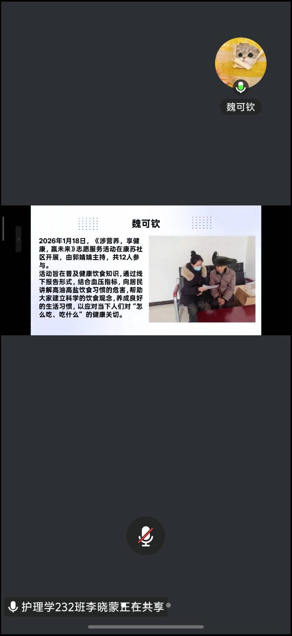 会议伊始,李岩老师对上一周学生志愿服务完成情况进行详细总结,充分肯定了同学们在实践中的积极表现与责任担当。多数同学深入基层社区,聚焦儿童关爱与老年服务两大重点,将在校所学知识转化为服务群众的实际行动,为社区老年人测量血压、开展健康宣教,耐心讲解日常保健知识,用真诚与专业获得了服务单位的一致好评。