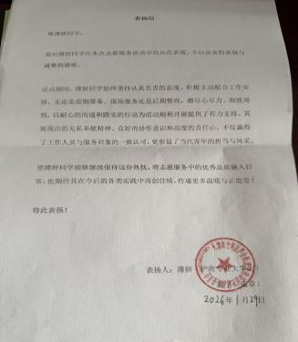 薄妍同学发挥护理专业优势,在社区居民家中为老人测量血压、讲解健康知识,以耐心细致的服务获得了居民的高度认可,并收到了社区出具的表扬信,用专业行动诠释了“守护健康”的初心。