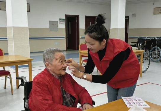 邓雨桐同学走进养老机构,为老人粘贴可爱的面部贴画、陪老人唠家常,用温柔的陪伴驱散了老人的孤单,让养老机构里充满了欢声笑语,传递着护理专业特有的人文关怀。