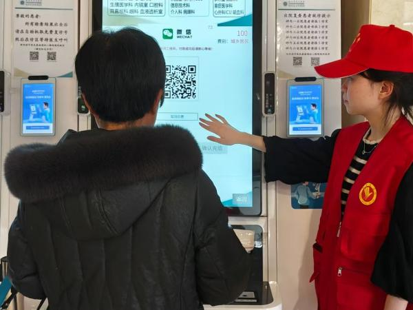 田晓慧同学驻守门诊大厅,提前熟悉了科室的分布位置与线上挂号流程,制作了包含科室指引、挂号步骤的简易导诊卡。面对行动不便的患者,她主动上前协助完成挂号、缴费、打印报告等流程;面对因排队等待而焦虑的患者,她用温和的语气安抚情绪,解答疑问。
