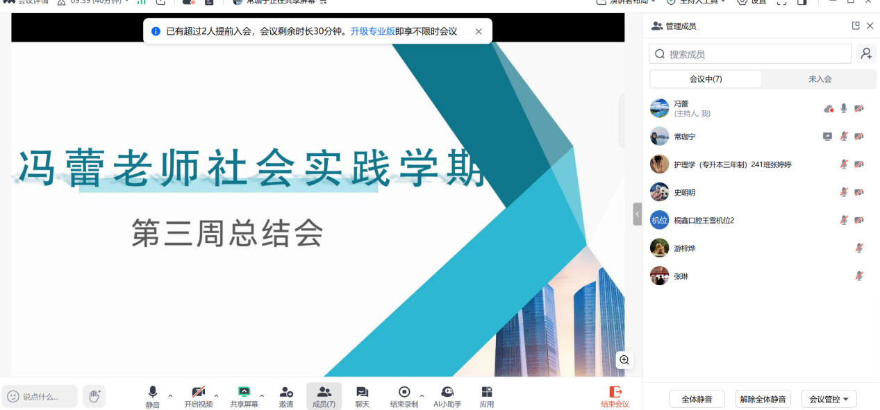为进一步抓实社会实践学期各项工作,保障学生实践成效与出行安全,近日,冯蕾老师主持召开社会实践学期第三周总结会,全体参与社会实践的学生参会。会议全面复盘了第三周社会实践开展情况,梳理问题、明确方向,同时着重强调了社会实践学期的核心价值与假期安全的重要要求。