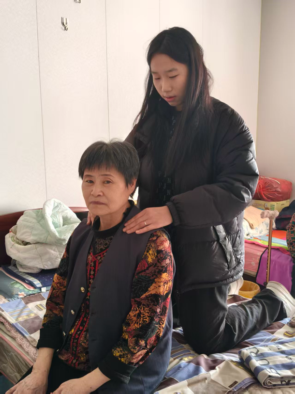 刘继蒙同学将关怀的目光投向养老院的老人们,她深知精神慰藉与躯体舒缓是老年康养的双重要义。走进养老院与老人们围坐畅谈,静心聆听他们的人生过往,以耐心地回应消解孤寂,滋养心灵;同时结合专业知识为老人们做简单的肢体舒缓指导,用专业温度为老年生活添一份舒心与安稳。