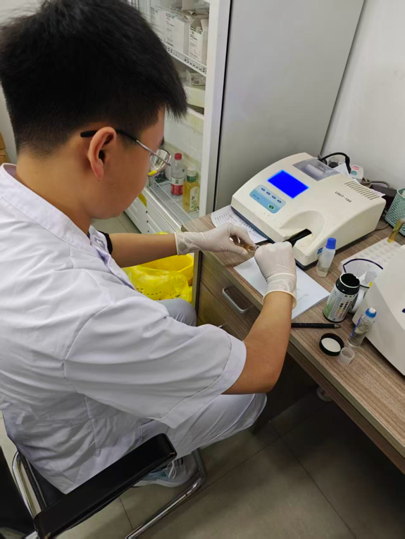 在辖区卫生院,陈飞宇同学开展健康监测志愿服务,为前来就诊的群众进行血压、血糖等多项健康指标测量。他严格按照医疗规范操作仪器,精准记录检测数据,耐心解答群众关于血压、血糖控制的疑问,结合专业知识给出科学的健康管理建议。陈飞宇在卫生院的志愿服务,不仅为群众提供了便捷的健康检测服务,更以实际行动践行了护理学子的责任与担当。