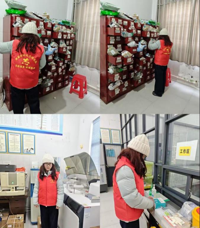 同日,杨璐同学在满是木质药柜的房间里,一抹鲜亮的志愿红格外温暖。志愿者杨璐正俯身忙碌,将一袋袋带着草木清香的药材仔细归位。她的指尖划过一个个抽屉,把散落的药材重新整理妥当。这间小小的屋子,在她细致的打理下,既有传统中药的沉静烟火气,又有新时代志愿精神的鲜活温度。平凡的举动里,藏着对邻里健康的守护,也让奉献的微光,在药香中缓缓流淌。