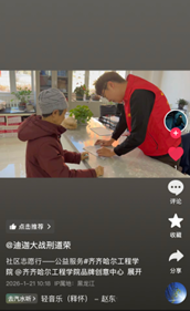 近日,齐齐哈尔工程学院“青春FUN肆拍”创意短视频实践项目圆满完成。YXY-139组全体成员携手参与,以镜头为笔、以生活为墨,在寒假时光里定格青春风采,用创意实践诠释了当代医学生的活力与担当。