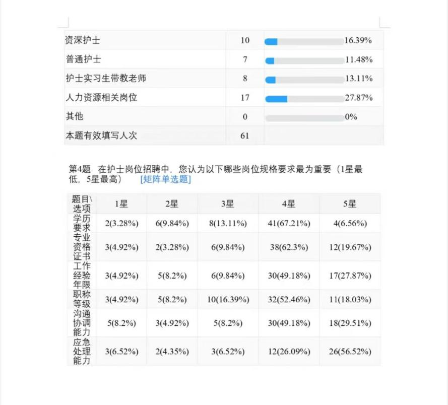 本次调研聚焦医院护士岗位的人才需求现状、能力要求与未来发展趋势,共回收有效问卷61份,调研结果清晰展现了行业发展的现实需求与未来方向。