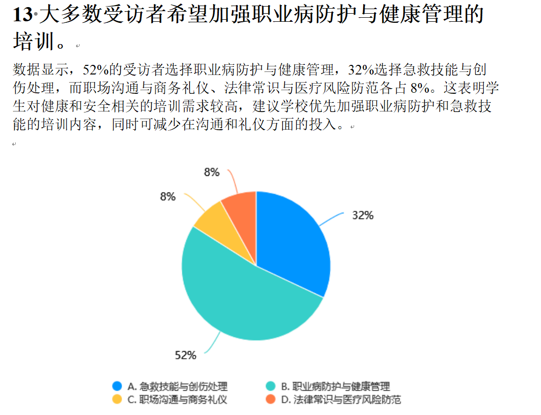 潘华宇同学聚焦漯河市企业对职业健康护理岗位的人才需求规格与服务产品迭代趋势,共收集50份有效问卷。调研覆盖企业规模、健康管理部门设置、核心岗位需求、学历与执业证书要求等维度,初步发现企业对护理人才的需求呈现多元化趋势,强调复合型技能与预防保健职能转变,同时重视技术应用与健康管理创新。