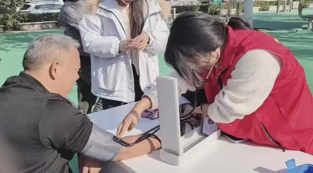 护理学241班王子慧同学身穿红马甲,在户外社区义诊活动中,正认真地为一位居民测量血压。她俯身调试仪器,耐心细致,将温暖与健康关怀送到了居民家门口。