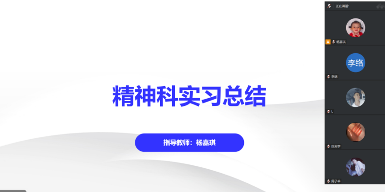 近日,杨嘉琪组精神实习工作顺利结束,为梳理实习中的实际收获、梳理实操过程中遇到的问题,本次实习总结会如期开展。组内全体实习学生参与本次会议,一同回顾实习期间的学习与实操经历,做好本次实习的收尾工作。