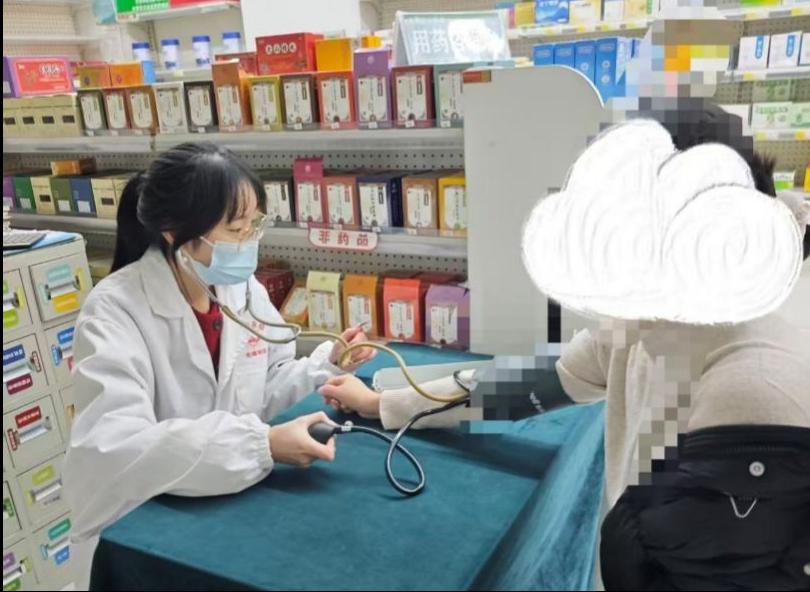 王雨晴同学前往当地社区玉笑大药房开展志愿服务,协助药房工作人员进行药品调配,并为到店患者提供血压测量服务。工作中,她身着白大褂、规范佩戴口罩,严格遵循医护行为规范,充分展现了护理学专业学子的专业素养与严谨态度。