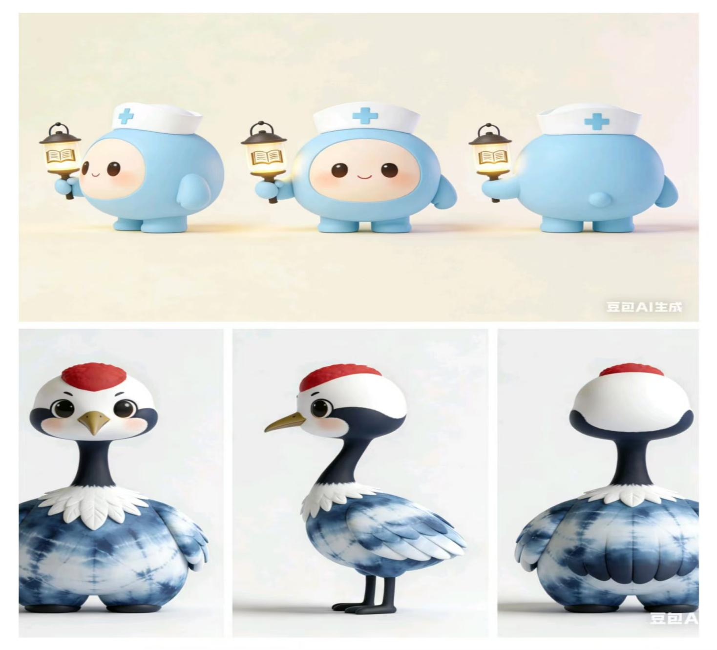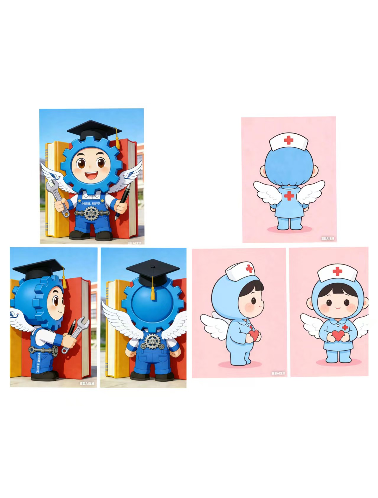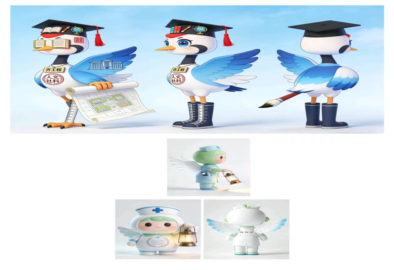徐梓凯聚焦护理学专业特色,以“提灯天使”为灵感,设计了系列护理主题吉祥物。作品采用清新的蓝白配色,搭配象征守护的翅膀与提灯元素,部分形象背后印有“慎独、博爱、精进”的护理精神标语,既贴合护理学专业的职业属性,又以软萌可爱的风格消解了专业的严肃感,让“白衣天使”的形象更具亲和力与感染力,彰显了护理学子的责任与温度。