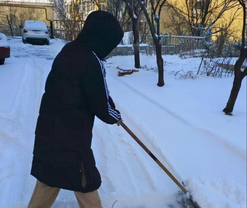 志愿服务当天,寒风凛冽,气温低至零下二十余度,但这丝毫没有阻挡学子们的服务热情。志愿者们身着醒目的红色志愿马甲,提前备好铁锹、扫帚、除冰铲等工具,分组奔赴社区主干道、十字路口、老年活动中心以及辖区内独居老人家门口等重点区域。现场分工明确,有的负责用铁锹铲开厚实的积雪,有的手持扫帚清扫零散残雪,有的则重点铲除路面顽固冰层,大家干劲十足、默契配合,挥舞工具的身影在白雪皑皑的社区中构成了一道靓丽的风景线。经过数小时的连续奋战,原本积雪结冰的路面被清理得干干净净,为居民开辟出了一条条安全通畅的出行通道。服务过程中,学子们还充分发挥护理学专业优势,主动走访独居老人家庭,不仅帮老人清扫院落积雪,还细心询问老人的身体状况和生活需求,协助搬运过冬物资、检查家中取暖设备安全,用专业且贴心的举动赢得了邻里们的纷纷点赞,不少居民主动拿出热水让志愿者们取暖,寒冷的冬日里涌动着浓浓的温情。(护理学232班孟子墨,护理学231班蒋欣言)
