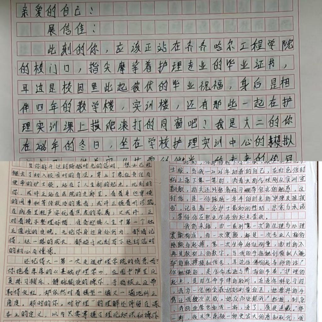 近日,齐齐哈尔工程学院医学院护理学专业YXY-095小组,在社会实践学期开展“给未来的信”主题活动。三名学子以笔墨为桥,写下对护理事业的热爱、成长感悟与职业规划,在时空对话中坚定医者初心。