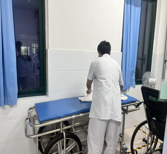 在医院的诊疗区,护理学专业护理学236班郭炯晨同学身着白衣,细致地为转运床更换床单,整理医疗设备。他动作规范、一丝不苟,用严谨的态度协助医护人员做好诊疗前的准备工作,为患者营造干净、舒适的就医环境,用专业素养践行着医学生的初心与使命。青春扎根社区,服务传递温暖