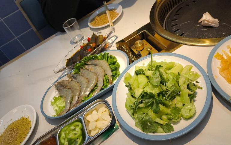 护理学233班龙鸿发带来了烤鲜虾的美食日记分享。先把鲜虾洗净剪须,铺在生菜叶上摆盘备用;黄瓜拍碎后加入蒜末、香菜、少许盐和香醋拌匀,做成凉拌黄瓜;海带结用清水冲洗后,加小米辣、蒜末、生抽、陈醋和少许糖拌匀入味;再准备好青椒圈、蒜片、干料碟和辣酱碟;吃的时候,把鲜虾和其他食材放到烤炉上烤熟,蘸上干料或辣酱即可。